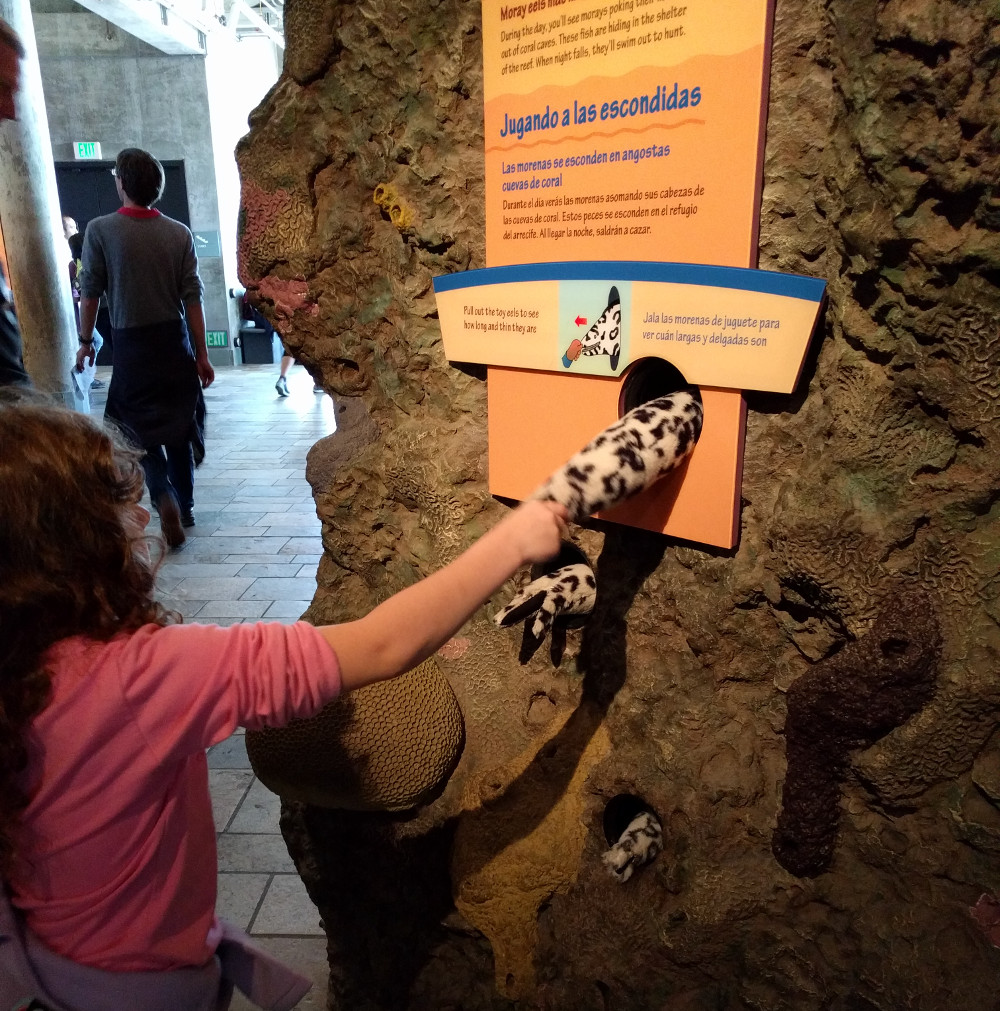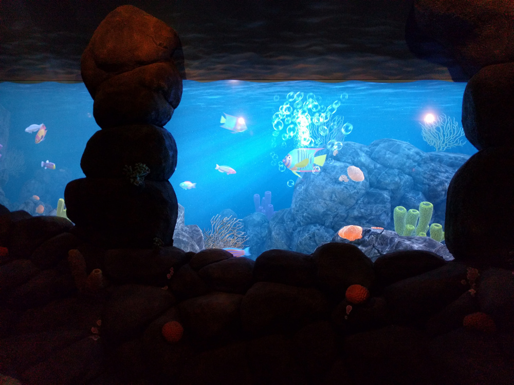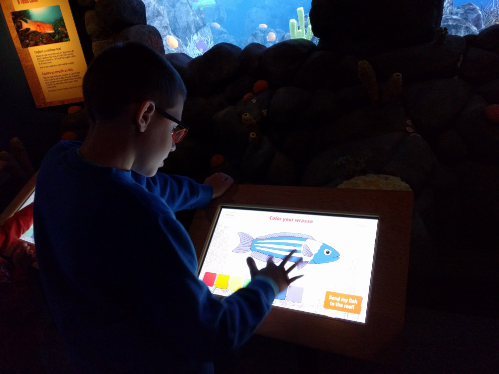 באזור הילדים הם יכולים לעצב לעצמם דגים באמצעות מחשב ואז באמצעות לחיצת כפתור להעיר אותם לחיים ולשלוח אותם אל האקווריום (המסך) הגדול שממול. רעיון מקסים שמעסיק את החבר'ה הצעירים שעה ארוכה…