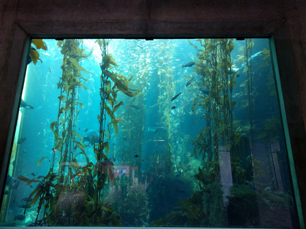 תצוגת יער האצות (Kelp Forest): אקווריום מרשים בגובה של כ-8.5 מטרים, שבתוכו יער תת ימי המכיל, בין היתר, צלופחים, סרדינים, כרישי נמר ועוד…