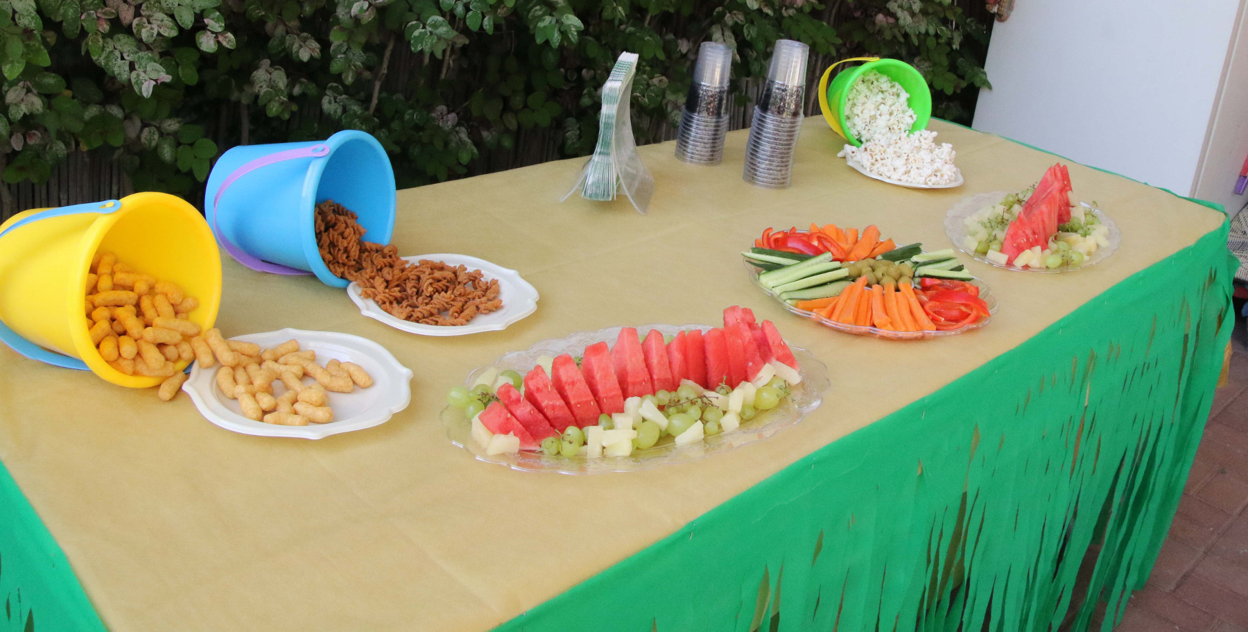 גם את שולחן האוכל עיצבנו בסגנון הישרדות: הכנו "חצאית הוואי" לשולחן ממפה ירוקה חד פעמית, את החטיפים הגשנו בתוך דליים וכמובן – דאגנו להרבה פירות וירקות מרעננים.