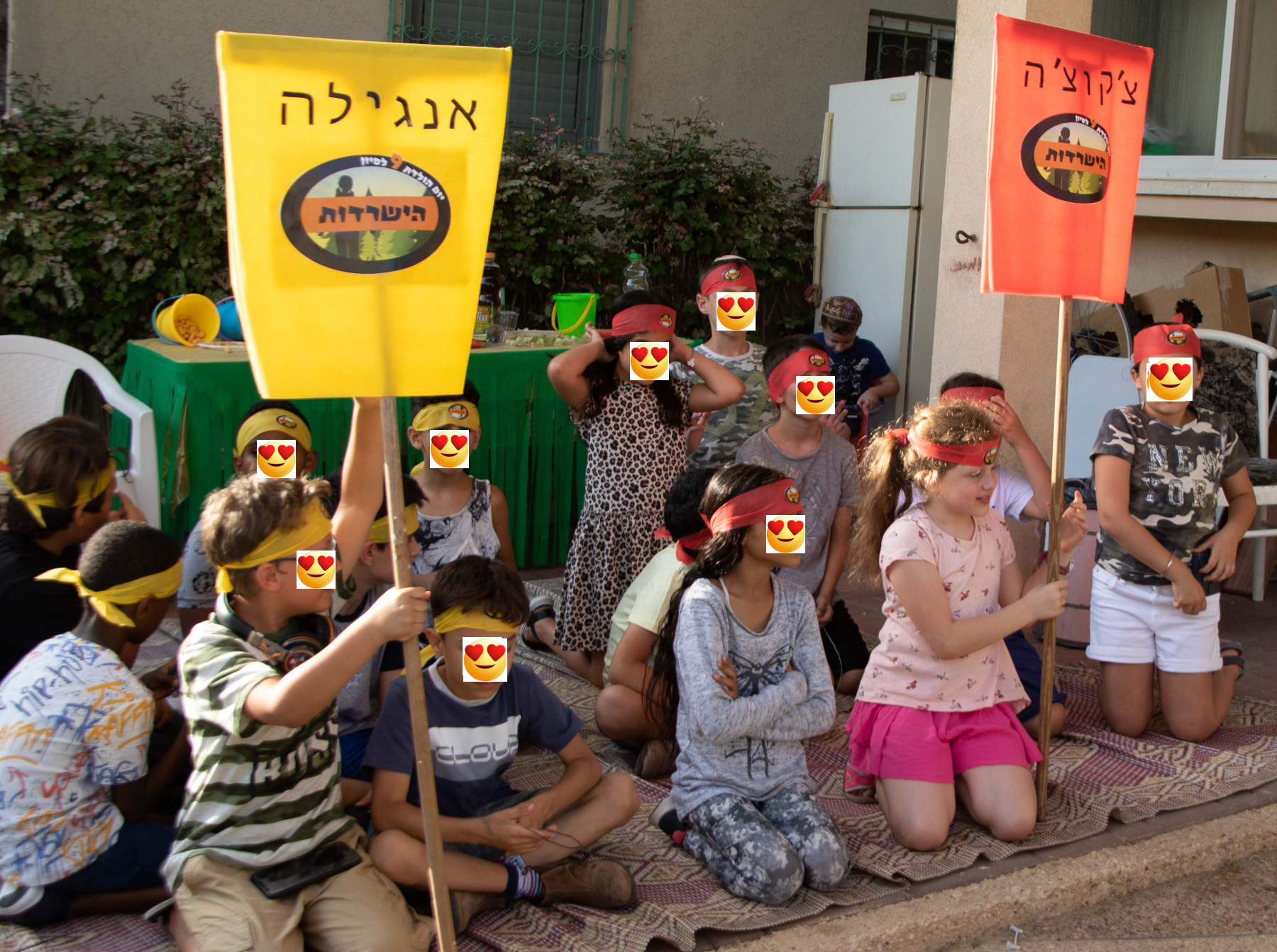 כמו בתוכנית הישרדות בטלויזיה, גם אצלנו היו שני שבטים שהתחרו ביניהם. בראש השבט הראשון – צ'קוצ'ה – הייתה כמובן סיון, ובראש השבט השני – אנגילה – נבחר אחד הילדים האורחים. כל ראש שבט קיבל את דגל השבט שלו, ולאחר חלוקת כל הילדים לשבטים, כשברקע מנגינת הישרדות המוכרת לכולם, הם קיבלו גם בנדנות מתאימות. את הבנדנות הכנתי ממפות חד פעמיות שעליהן הדבקתי את סמל הישרדות שלנו.