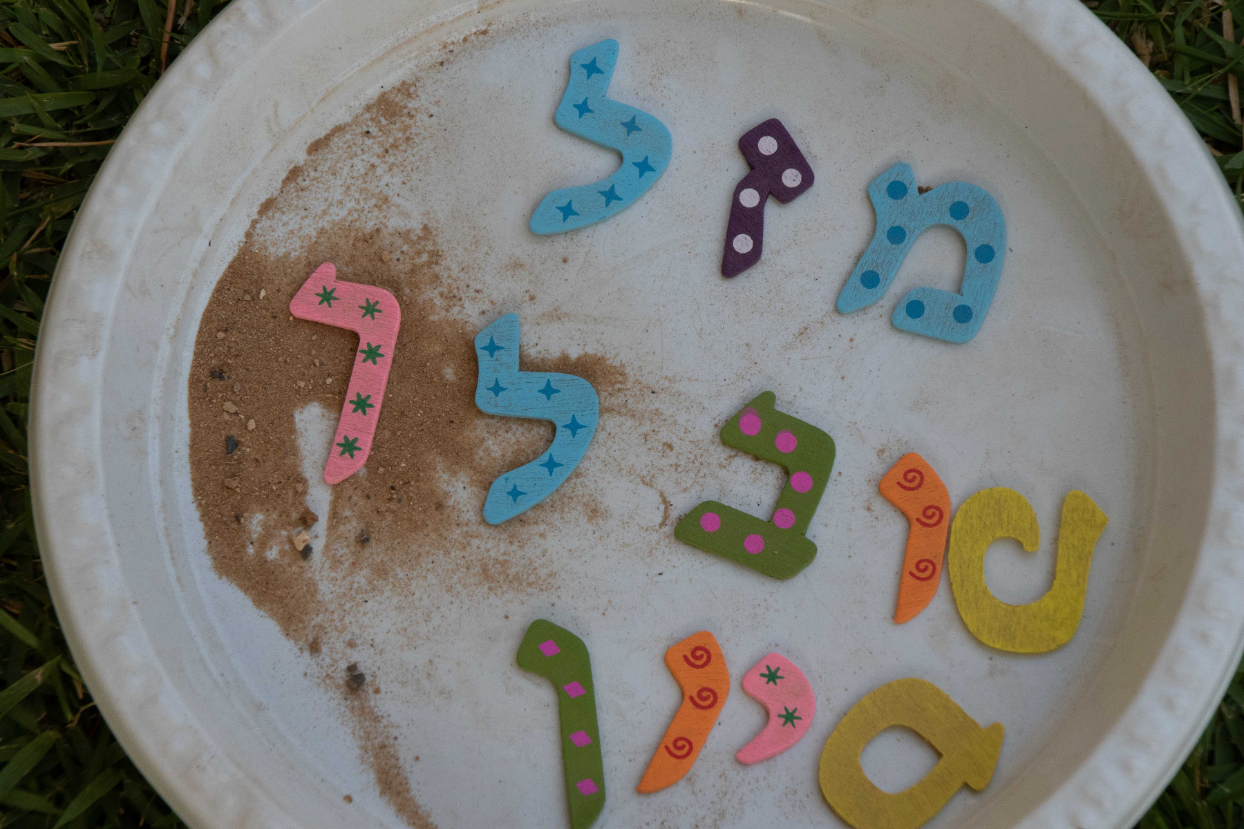 * 2 קערות עם חול, בתוך כל אחת הטמנתי מראש 12 אותיות שירכיבו בסופו של דבר את המשפט "מזל טוב לך סיון".