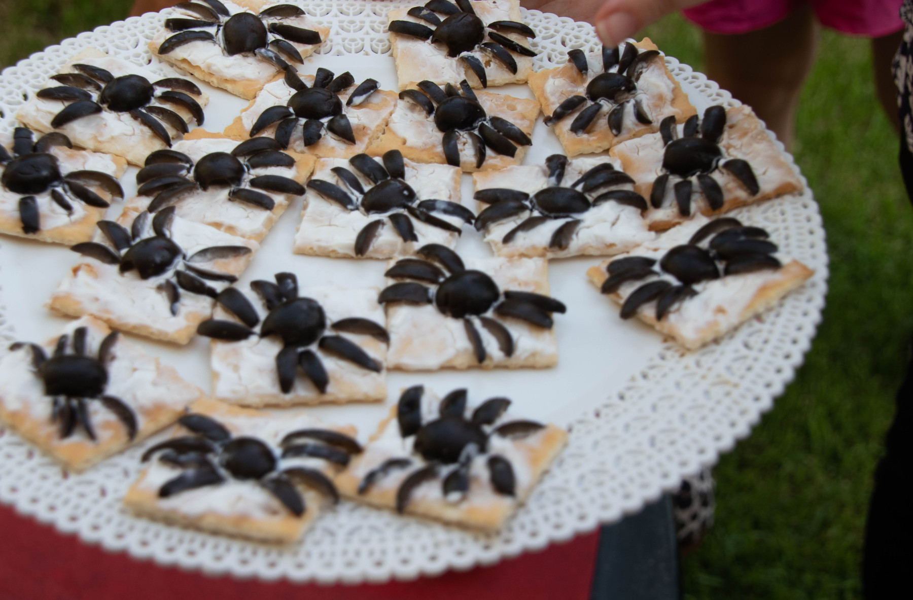 את העכביש הכנתי מזית שחור שהונח על קרקר עם גבינה לבנה.
