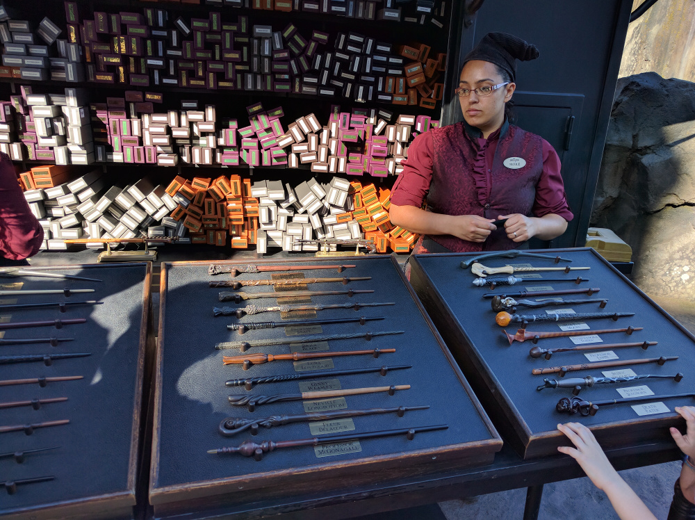 אפילו פגשנו את הכרטיסן הנחמד שהצטלם עם כל מי שרצה. הסתובבנו בסמטה בין החנויות השונות, העתק מדוייק לאלה שבסרט, עד שהחלטנו להיכנס לחנות למטות קסמים בה ילד אקראי מהקהל בחר לעצמו את מטה הקסמים שלו – או שאולי המטה בחר בו? – לא לפני שבחר בכמה מטות שלא כל כך התאימו לו ובדרך חולל כמה קסמים שהלהיבו את הקהל. כמובן שכל אחד יכול היה גם לרכוש מטה קסמים, ב 39$ בלבד, אבל אנחנו ויתרנו היות וזה היה רק המתקן הראשון אליו נכנסנו.