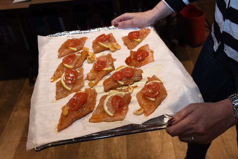 פורל ורוד צלוי בתנור בתוספת עגבניות שרי בצבעים, עשבי תיבול ושום