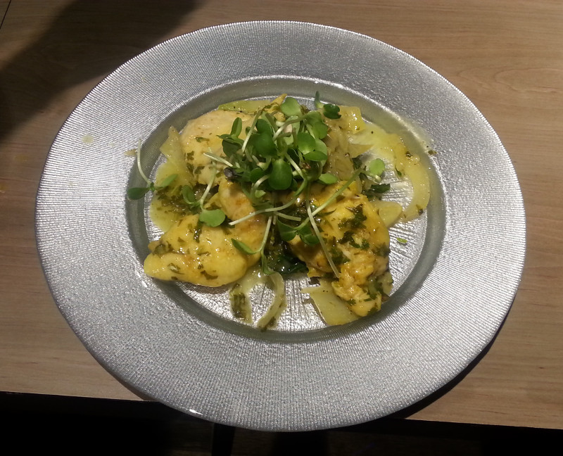 חזה עוף צרוב במחבת מוגש על מצע של שומר ועלי מנגולד