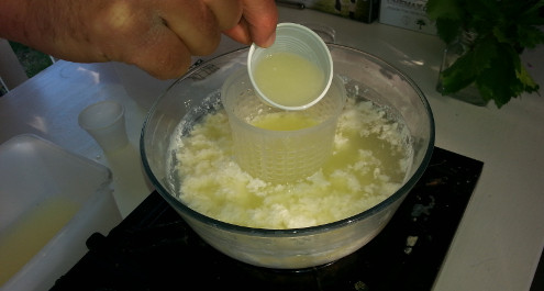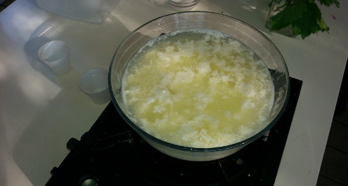 מוסיפים חומץ תוך כדי בחישה איטית, עד שמי הגבינה צלולים בצבע ירקרק-צהוב. שימו לב: כמות קטנה מדי של חומץ תניב כמות גבינה קטנה, ואילו כמות גדולה מדי תניב גבינה קשה במרקם גומי.