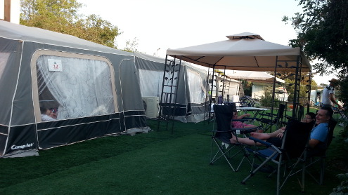 מחוץ לאוהל, כמו מרפסת, הייתה לנו מעין פרגולה קטנה ומתחתיה שולחן עם 4 כסאות, וכמו שכבר כתבתי קודם, במרחק קטן נמצאו חדרי הרחצה והשירותים (שהיו נקיים ביותר בכל הפעמים שנכנסתי אליהם).