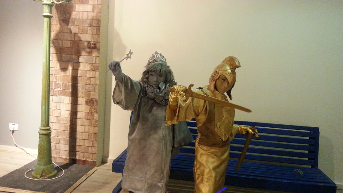 סיימנו לצייר וחזרנו לסיורנו בשכונה כשלפתע על ספסל ראינו פסל כסוף שלמרבה הפלא נע כאשר קרבנו אליו, וכך התוודענו גם לאמנות הפסלים החיים. מתן וילדה חמודה נוספת התנדבו להפוך לפסלים חיים והדגימו לנו את התהליך.