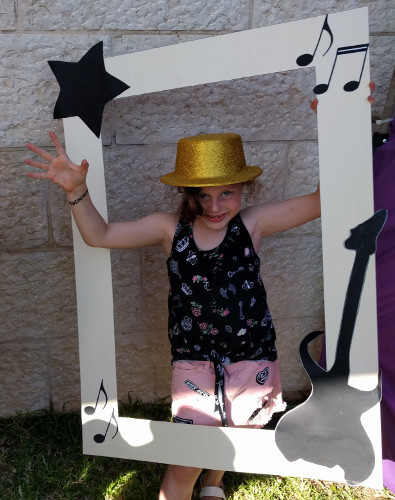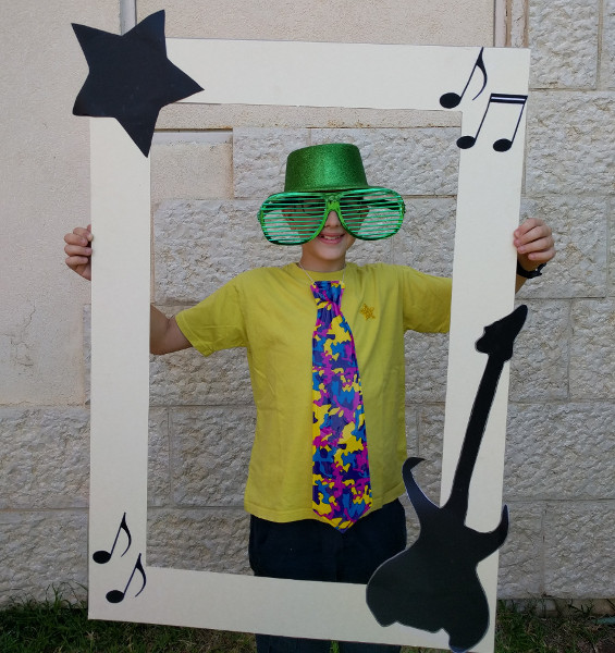2. קניתי קרטון ביצוע שבתוכו גזרתי חלון ומסביב הדבקתי גיטרות וכוכבים שגזרתי מבריסטול שחור, וכל ילד שהגיע הוזמן להצטלם עם כל מיני אביזרים כמו כובעים, עניבות, משקפיים וכו' שקניתי מבעוד מועד בחנות "שקל סטור".