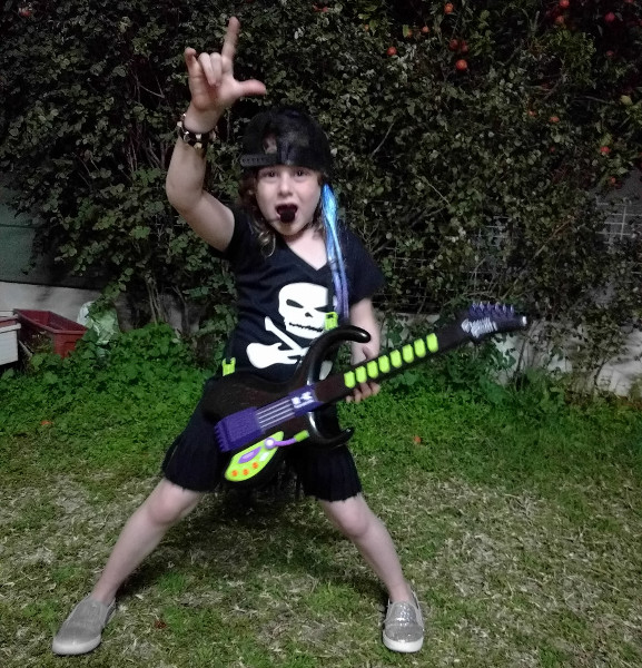 כבר שנתיים בערך שסיון מתעקשת שכשתהיה גדולה היא רוצה להיות רוקיסטית. בשנה שעברה כשטסנו לארה"ב היא השקיעה כמעט את כל דמי הכיס שלה כדי לקנות גיטרה חשמלית (צעצוע, ולצערי נטול כפתור "השתק"), בפורים האחרון הכנתי לה תחפושת של רוקיסטית וכבר זמן מה שהיא מתעקשת שהצבעים האהובים עליה הם שחור וסגול.