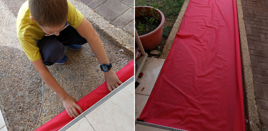 2. קניתי גליל מפה חד פעמית בצבע אדום, וממנו פרסתי שטיח אדום לכניסה לחצר.