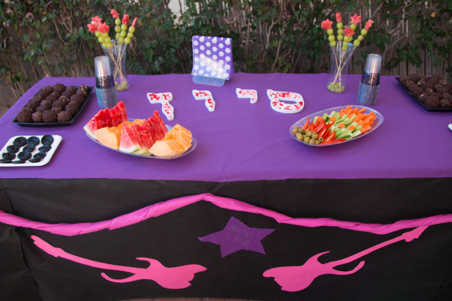 3. גזרתי מבריסטולים צבעוניים גיטרות וכוכבים, ובעזרתם קישטתי את השולחן. סיון התעקשה שהכיבוד יכלול בעיקר ירקות ופירות, ובנוסף הכנו ביחד כדורי שוקולד וקנינו עוד קצת חטיפים.